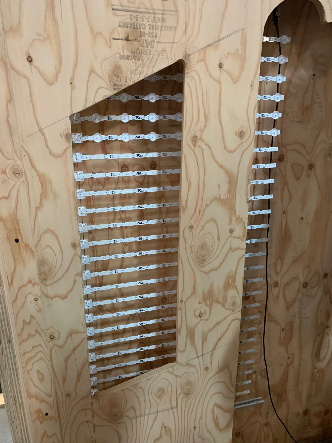 Traditionally, stained glass is backlit using floodlights positioned at a distance to simulate sunlight. However, the architectural conditions of this site, specifically a restricted depth of only twelve inches behind the window, made conventional solutions impractical .