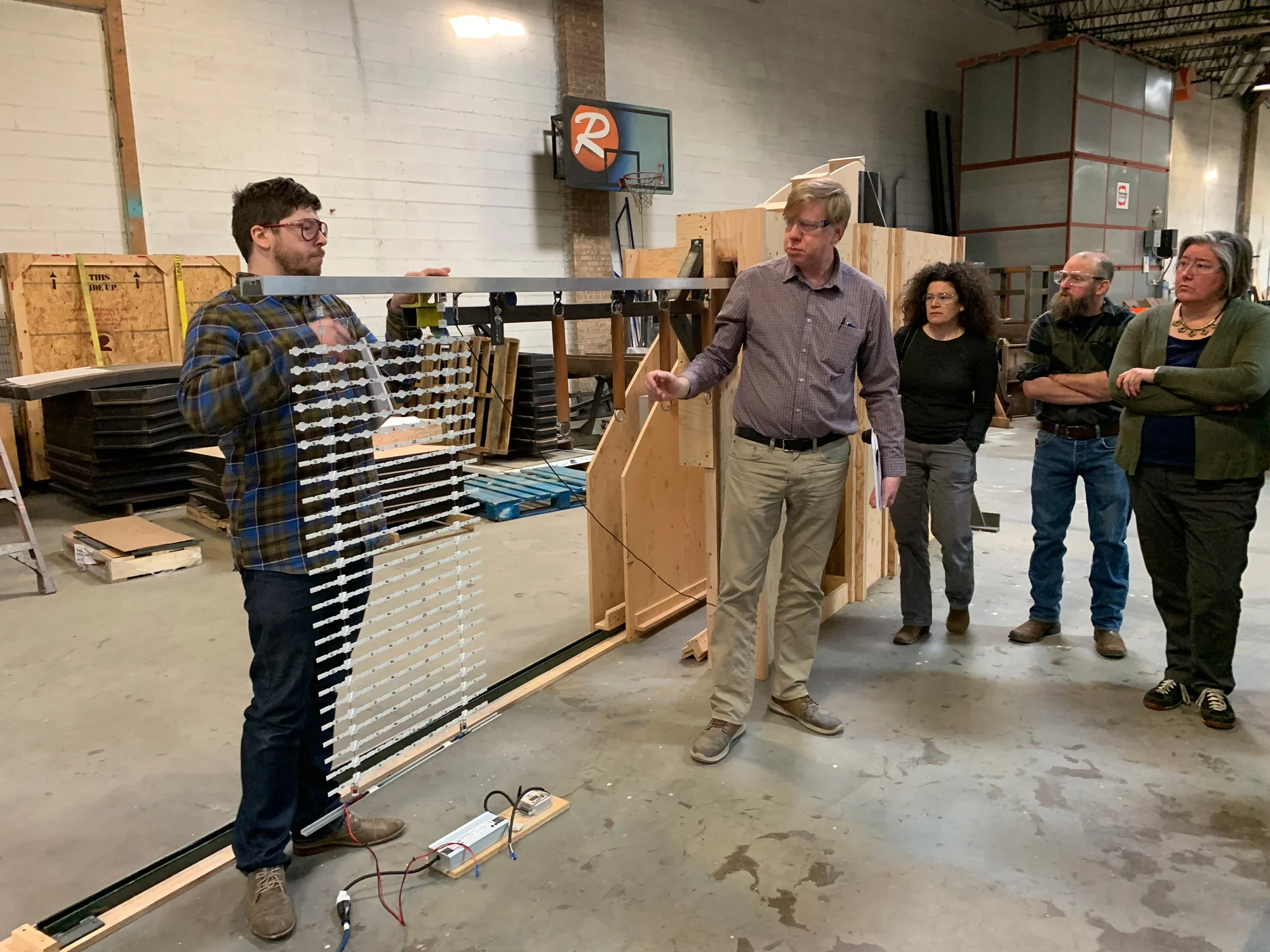 - The LumiGrid was mounted to a retractable C channel rail system, allowing the entire lighting assembly to slide out for inspection or repair without disturbing the artwork .