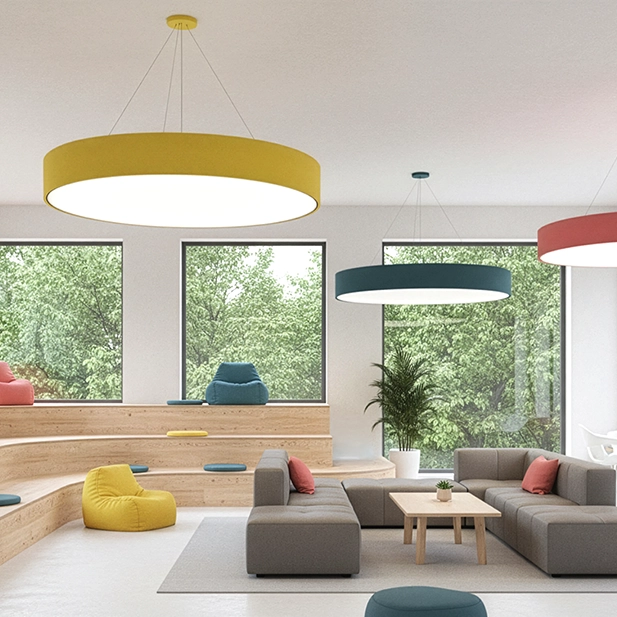 Circa Silenza™ est un luminaire acoustique circulaire suspendu qui combine un éclairage DEL architectural à un feutre acoustique en polyester (PET) haut de gamme intégré ainsi qu’un diffuseur LightTex Silent pour l’absorption sonore.